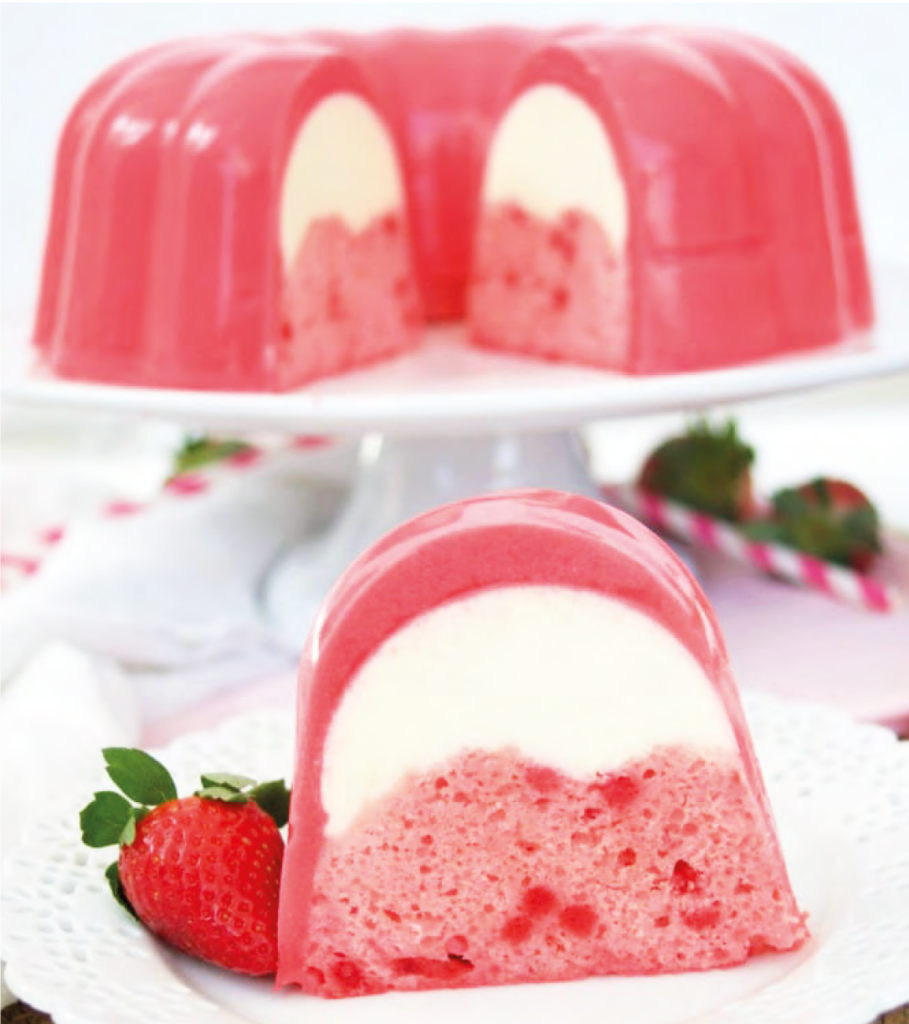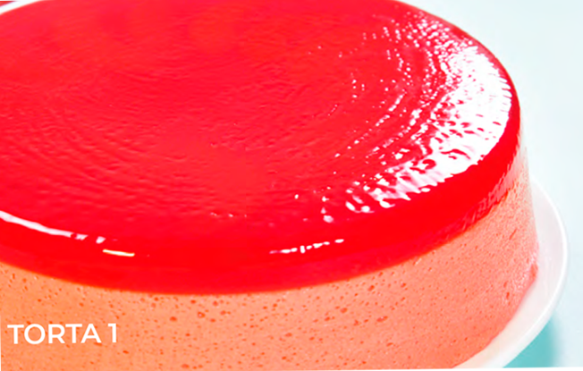 Para esta gelatina usa- mos kappa en sinergia con una goma porque al tener agua libre es necesa- rio espesarla para un mejor control de la gelificación. Luego con azúcar, el agua caliente y un saborizante de fresa logramos una sú- per gelatina para la base.
