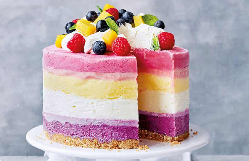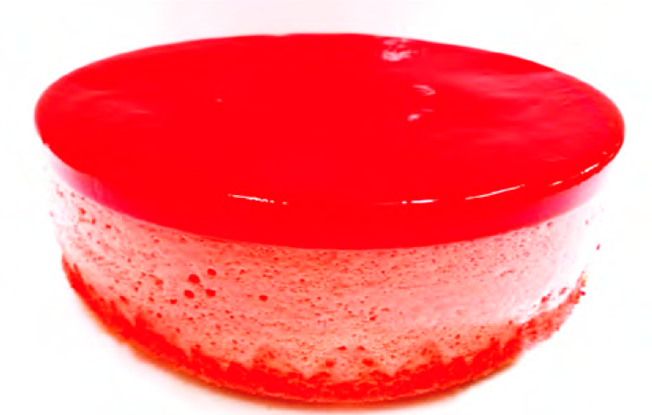 Esta torta helada es 100% vegana, usamos la misma base de la gelatina vegetal y para la mousse reconstruimos una clara de huevo con agua, proteína de soya, xantana y azúcar.